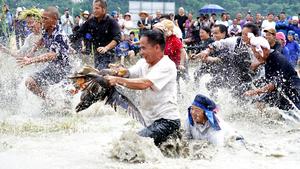 (250923) -- BEIJING, 23 septiembre, 2025 (Xinhua) -- Personas participan en un concurso de caza de patos durante las celebraciones del festival de la cosecha de los agricultores chinos, en el distrito de Rongjiang, en la provincia de Guizhou, en el suroeste de China, el 23 de septiembre de 2025. El festival de la cosecha de los agricultores chinos es el primer festival nacional creado específicamente para los agricultores del país. (Xinhua/Wang Bingzhen) (oa) (ah) (ce)