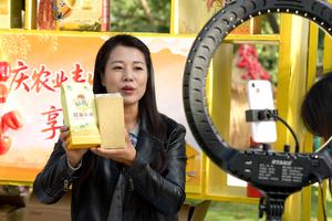 (250923) -- BEIJING, 23 septiembre, 2025 (Xinhua) -- Una expositora promociona productos agrícolas locales especiales a través de una retransmisión en vivo durante las celebraciones del festival de la cosecha de los agricultores chinos, en el distrito de Gaolan, Lanzhou, en la provincia de Gansu, en el noroeste de China, el 23 de septiembre de 2025. El festival de la cosecha de los agricultores chinos es el primer festival nacional creado específicamente para los agricultores del país. (Xinhua/Wang Peng) (oa) (ah) (ce)