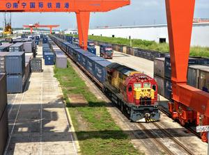 (250923) -- NANNING, 23 septiembre, 2025 (Xinhua) -- Vista aérea tomada con un dron el 23 de septiembre de 2025 de un tren de carga China-Vietnam saliendo del Puerto Ferroviario Internacional de Nanning, en Nanning, en la región autónoma de la etnia zhuang de Guangxi, en el sur de China. Hasta el 22 de septiembre, los trenes de carga que salieron de Guangxi con destino a Vietnam transportaron un total de 26.000 TEU (unidades equivalentes a veinte pies) de mercancías de exportación, lo que representa un aumento interanual del 173 por ciento, de acuerdo con China Railway Nanning Group Co., Ltd. (Xinhua/Xing Guangli) (jg) (ra) (ce)