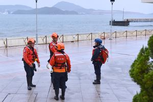 (250923) -- HONG KONG, 23 septiembre, 2025 (Xinhua) -- Miembros del Servicio de Ayuda Civil patrullan a lo largo de una costa, en Hong Kong, en el sur de China, el 23 de septiembre de 2025. El Observatorio de Hong Kong emitió la Señal de Tormenta o Vendaval del Noroeste número 8 para el supertifón Ragasa el martes por la tarde. (Xinhua/Chen Duo) (jg) (ra) (vf)