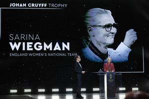 (250923) -- PARIS, 23 septiembre, 2025 (Xinhua) -- Imagen del 22 de septiembre de 2025 de la directora técnica neerlandesa de Inglaterra, Sarina Wiegman (d), pronuncia un discurso tras ganar el premio Johan Cruyff al mejor director técnico de un equipo femenino durante la ceremonia de premiación del Balón de Oro 2025 de France Football en el Teatro del Chatelet, en París, Francia. (Xinhua/Gao Jing) (oa) (ah)