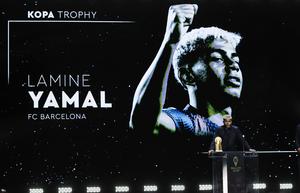(250923) -- PARIS, 23 septiembre, 2025 (Xinhua) -- Imagen del 22 de septiembre de 2025 del jugador español de Barcelona, Lamine Yamal, hablando después de recibir el Trofeo Kopa al mejor jugador menor de 21 años durante la ceremonia de premiación del Balón de Oro 2025 de France Football en el Teatro del Chatelet, en París, Francia. (Xinhua/Gao Jing) (oa) (ah)