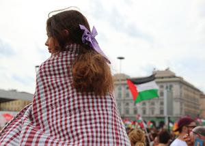 (250923) -- ROMA, 23 septiembre, 2025 (Xinhua) -- Imagen del 22 de septiembre de 2025 de una niña participando en una protesta pro-Palestina, en Roma, Italia. (Xinhua/Li Jing) (oa) (ah) (ce)