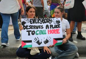 (250923) -- ROMA, 23 septiembre, 2025 (Xinhua) -- Imagen del 22 de septiembre de 2025 de estudiantes participando en una protesta pro-Palestina, en Roma, Italia. (Xinhua/Li Jing) (oa) (ah) (ce)
