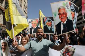 (250923) -- NAPLUSA, 23 septiembre, 2025 (Xinhua) -- Palestinos celebran con retratos de los líderes palestinos, Yasser Arafat, y Mahmoud Abbas, durante una manifestación en la ciudad cisjordana de Naplusa, el 23 de septiembre de 2025. El martes se llevaron a cabo manifestaciones en varias ciudades de Cisjordania para celebrar el reconocimiento occidental del Estado de Palestina y mostrar solidaridad con el pueblo de la Franja de Gaza. (Xinhua/Nidal Eshtayeh) (vf) (ce)