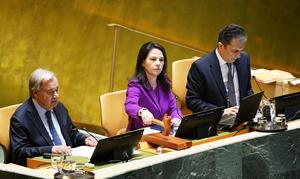 (250923) -- NACIONES UNIDAS, 23 septiembre, 2025 (Xinhua) -- La presidenta de la Asamblea General de las Naciones Unidas (AGNU), Annalena Baerbock (c), golpea el mazo para comenzar el debate general del 80º período de sesiones de la AGNU, en la sede de la Organización de las Naciones Unidas (ONU), en Nueva York, el 23 de septiembre de 2025. Representantes de los Estados miembros de la ONU, incluidos cerca de 150 jefes de Estado y Gobierno, se turnarán en el podio de la AGNU para pronunciar discursos sobre cuestiones mundiales durante el debate general de la AGNU que comenzó el martes. (Xinhua/Wu Xiaoling) (jg) (ra) (ce)