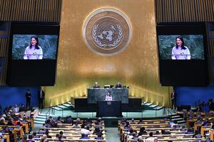 (250923) -- NACIONES UNIDAS, 23 septiembre, 2025 (Xinhua) -- Imagen del 22 de septiembre de 2025 de Annalena Baerbock, presidenta del 80° período de sesiones de la Asamblea General de las Naciones Unidas, hablando durante la Reunión de Alto Nivel con motivo del 30º aniversario de la Cuarta Conferencia Mundial de la Mujer, en la sede de la Organización de las Naciones Unidas (ONU), en Nueva York. La Reunión de Alto Nivel con motivo del 30º aniversario de la Cuarta Conferencia Mundial de la Mujer se llevó a cabo el lunes en la sede de la ONU en Nueva York. (Xinhua/Li Rui) (jg) (ra) (ce)