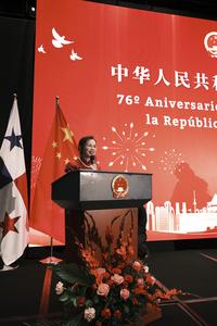 (250923) -- CIUDAD DE PANAMA, 23 septiembre, 2025 (Xinhua) -- Imagen del 22 de septiembre de 2025 de la embajadora de China en Panamá, Xu Xueyuan, pronunciando un discurso durante un evento celebrado por la embajada china en Panamá, en la Ciudad de Panamá, capital de Panamá. La embajada china en Panamá celebró el lunes el 76º aniversario de la fundación de la República Popular China con una actividad cultural realizada en la capital panameña. (Xinhua/Xu Yongzheng) (jg) (ra) (vf)