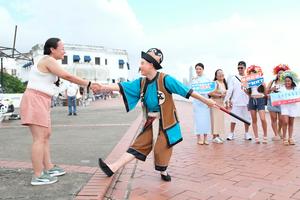 (250922) -- CIUDAD DE PANAMA, 22 septiembre, 2025 (Xinhua) -- Un actor (c) de la ópera Gaojia, integrante de la delegación cultural de la ciudad china de Quanzhou, interactúa con una mujer, en el Casco Antiguo de la Ciudad de Panamá, capital de Panamá, el 22 de septiembre de 2025. Una delegación cultural procedente de Quanzhou, ciudad costera de la provincia china de Fujian, ofreció el lunes una colorida muestra de expresiones artísticas tradicionales en el Casco Antiguo de la capital panameña, cautivando a residentes y turistas por igual. (Xinhua/Xu Yongzheng) (oa) (ah) (vf)