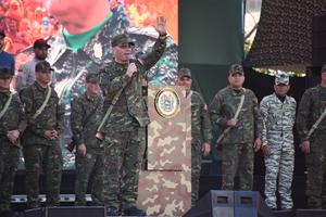 (250923) -- CARACAS, 23 septiembre, 2025 (Xinhua) -- El ministro venezolano de Defensa, Vladimir Padrino López (i-frente), habla durante una marcha, en Caracas, Venezuela, el 23 de septiembre de 2025. Miles de venezolanos se movilizaron el martes por la principal arteria de Caracas, la avenida Bolívar, en una masiva demostración de respaldo al presidente venezolano, Nicolás Maduro, y en rechazo a las políticas de desestabilización que, según denuncian, son promovidas por el Gobierno de Estados Unidos. (Xinhua/Marcos Salgado) (ms) (oa) (ah) (ce)