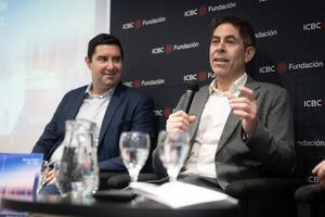 (250924) -- BUENOS AIRES, 24 septiembre, 2025 (Xinhua) -- Imagen del 23 de septiembre de 2025 de Mariano Delfini (d), representante de la empresa Iflow S.A., hablando junto a Esteban Lancieri (i), representante de la empresa Andex Group, durante un encuentro en la Fundación ICBC, en la ciudad de Buenos Aires, capital de Argentina. La Región Administrativa Especial de Hong Kong fue presentada como una plataforma estratégica para las compañías argentinas interesadas en explorar oportunidades en Asia, durante un encuentro realizado el martes en la ciudad de Buenos Aires que reunió a decenas de empresarios locales. (Xinhua/Martín Zabala) (mz) (jg) (ra) (ce)