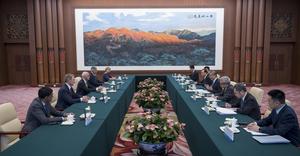 (250924) -- BEIJING, 24 septiembre, 2025 (Xinhua) -- El ministro de Relaciones Exteriores chino, Wang Yi, también miembro del Buró Político del Comité Central del Partido Comunista de China, se reúne con una delegación del Congreso de Estados Unidos encabezada por el representante Adam Smith, en Beijing, capital de China, el 23 de septiembre de 2025. (Xinhua/Cai Yang) (jg) (ra) (ce)