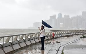 (250924) -- HONG KONG, 24 septiembre, 2025 (Xinhua) -- Una mujer toma fotografías en medio del fuerte viento y la lluvia en el puerto Victoria, en Hong Kong, en el sur de China, el 24 de septiembre de 2025. El Observatorio de Hong Kong emitió la señal de huracán número 10, la advertencia de máximo nivel, a las 2:40 a.m. hora local del miércoles mientras el supertifón Ragasa pasaba rápidamente. Esta fue la segunda vez que se activó la alerta máxima este año después del paso del tifón Wipha el 10 de julio. Hong Kong no ha repetido la señal número 10 en un año desde 1964. (Xinhua/Chen Duo) (ah) (vf)