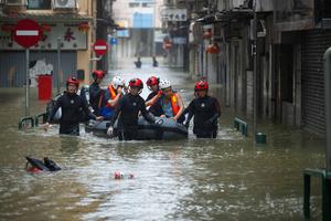 (250924) -- MACAO, 24 septiembre, 2025 (Xinhua) -- Trabajadores de la autoridad aduanera local ayudan a ciudadanos varados a evacuar una calle inundada, en Macao, en el sur de China, el 24 de septiembre de 2025. El supertifón Ragasa pasó a menos de 100 km de la Región Administrativa Especial de Macao el miércoles por la mañana, provocando vendavales y fuertes lluvias, informó la Oficina Meteorológica de Macao, que emitió la señal de ciclón tropical número 10 a las 5:30 a.m. hora local. (Xinhua/Cheong Kam Ka) (jg) (ra) (ce)