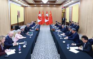 (250924) -- NUEVA YORK, 24 septiembre, 2025 (Xinhua) -- El primer ministro chino, Li Qiang, se reúne con el primer ministro canadiense, Mark Carney, en Nueva York, Estados Unidos, el 23 de septiembre de 2025. (Xinhua/Wang Ye) (jg) (ra) (ce)
