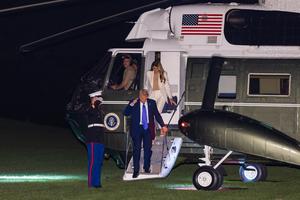 (250924) -- WASHINGTON, D.C., 24 septiembre, 2025 (Xinhua) -- Imagen del 23 de septiembre de 2025 del presidente estadounidense, Donald Trump, y la primera dama, Melania Trump, descendiendo del Marine One al llegar a la Casa Blanca, en Washington, D.C., Estados Unidos. Trump publicó el martes en redes sociales que considera que Ucrania, con el apoyo de Europa y de la Organización del Tratado del Atlántico Norte, "está en posición de luchar y recuperar toda Ucrania en su forma original". (Xinhua/Hu Yousong) (ah) (vf)