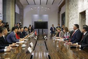 (250924) -- CIUDAD DE MEXICO, 24 septiembre, 2025 (Xinhua) -- Imagen del 23 de septiembre de 2025 del embajador de China en México, Chen Daojiang (5-i), reuniéndose con la presidenta de la Mesa Directiva del Senado mexicano, Laura Itzel Castillo (4-d), en la antigua Casona de Xicoténcatl, en la Ciudad de México, capital de México. Políticos, diplomáticos, académicos, empresarios y comunicadores de México y China evidenciaron el martes en el Senado mexicano el fortalecimiento del intercambio cultural y artístico entre China y México, calificándolo como una de las más enriquecedoras formas de diplomacia. (Xinhua/Li Mengxin) (ah) (ce)