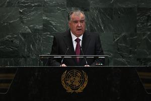 (250924) -- NACIONES UNIDAS, 24 septiembre, 2025 (Xinhua) -- Imagen del 23 de septiembre de 2025 del presidente tayiko, Emomali Rahmon, pronunciando un discurso durante el debate general del 80º período de sesiones de la Asamblea General de las Naciones Unidas, en la sede de la Organización de las Naciones Unidas, en Nueva York. (Xinhua/Li Rui) (ah) (vf)