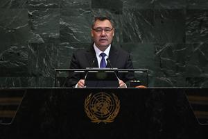 (250924) -- NACIONES UNIDAS, 24 septiembre, 2025 (Xinhua) -- Imagen del 23 de septiembre de 2025 del presidente kirguís, Sadyr Japarov, pronunciando un discurso durante el debate general del 80º período de sesiones de la Asamblea General de las Naciones Unidas, en la sede de la Organización de las Naciones Unidas, en Nueva York. (Xinhua/Li Rui) (ah) (vf)