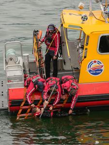 (250928) — VANCOUVER, 28 septiembre, 2025 (Xinhua) — Imagen del 27 de septiembre de 2025 de miembros de la Real Fuerza Canadiense de Búsqueda y Rescate Marítimo realizando una demostración de rescate frente al Canada Place en el Día del Puerto, en Vancouver, Columbia Británica, Canadá. El evento anual contó con exhibiciones marítimas, demostraciones marinas, exposiciones comunitarias y actividades familiares para mostrar las operaciones portuarias de la ciudad. (Xinhua/Liang Sen) (oa) (ah)