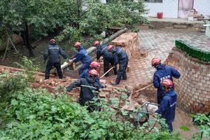 (250928) -- ZHANGXIAN, 28 septiembre, 2025 (Xinhua) -- Bomberos realizan operaciones de limpieza y remoción de riesgos, en la aldea de Wangjiahe, en el distrito de Zhangxian, en la ciudad de Dingxi, en la provincia de Gansu, en el noroeste de China, el 28 de septiembre de 2025. Un sismo de magnitud 5,6 sacudió el distrito de Longxi, en la ciudad de Dingxi, a las 05:49 del sábado. El sismo se sintió con fuerza en los distritos de Longxi, Zhangxian, Weiyuan y Lintao, en la ciudad de Dingxi, así como en el distrito de Wushan, en la ciudad de Tianshui. Actualmente, los residentes afectados han sido reubicados y alojados rápidamente y los trabajos de limpieza y eliminación de riesgos en las carreteras y casas dañadas están en marcha de manera ordenada. (Xinhua/Lang Bingbing) (rtg) (ah)
