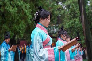 (250928) -- QUFU, 28 septiembre, 2025 (Xinhua) -- Participantes recitan las Analectas de Confucio, o Lunyu en chino, durante una ceremonia para conmemorar el aniversario número 2.576 del nacimiento del antiguo filósofo chino Confucio, en Qufu, en la provincia de Shandong, en el este de China, el 28 de septiembre de 2025. Qufu, la ciudad natal de Confucio, en la provincia oriental china de Shandong, celebró el domingo ceremonias tanto en línea como en forma presencial para conmemorar el aniversario número 2.576 del nacimiento del filósofo. (Xinhua/Zhu Zheng) (rtg) (ah)