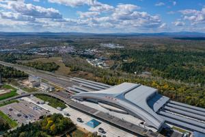 (250928) — CHANGCHUN, 28 septiembre, 2025 (Xinhua) — Vista aérea tomada con un dron el 26 de septiembre de 2025 de la Estación de Ferrocarriles de Changbaishan, en la sección Shenyang-Baihe del Ferrocarril de Alta Velocidad Shenyang-Jiamusi, en la prefectura autónoma de la etnia coreana de Yanbian, en la provincia de Jilin, en el noreste de China. Una nueva vía ferroviaria de alta velocidad comenzó a operar el domingo, acortando significativamente el tiempo de viaje de Beijing a la conocida montaña Changbai en la provincia nororiental de Jilin, dando aún mayor un impulso al creciente mercado chino de deportes de invierno y turismo de hielo y nieve. El tramo Shenyang-Baihe del ferrocarril de alta velocidad Shenyang-Jiamusi, diseñado para alcanzar una velocidad de 350 kilómetros por hora, comenzó oficialmente a prestar servicio el domingo. (Xinhua/Zhang Nan) (rtg) (ah)
