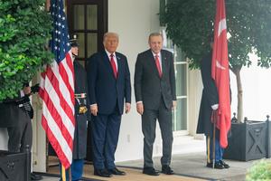 (250925) -- WASHINGTON, 25 septiembre, 2025, (Xinhua) -- El presidente estadounidense, Donald Trump (2-i), recibe al presidente turco, Recep Tayyip Erdogan, en la Casa Blanca, en Washington, D.C., Estados Unidos, el 25 de septiembre de 2025. (Xinhua/Hu Yousong) (rtg) (ra) (vf)