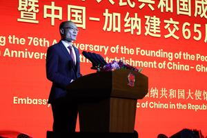(250928) -- ACRA, 28 septiembre, 2025 (Xinhua) -- Imagen del 26 de septiembre de 2025 del embajador de China en Ghana, Tong Defa, hablando en una recepción para festejar el 76.º aniversario de la fundación de la República Popular China y el 65.º aniversario del establecimiento de las relaciones diplomáticas China-Ghana, en la embajada de China en Ghana, en Acra, Ghana. (Xinhua/Seth) (rtg) (ah)