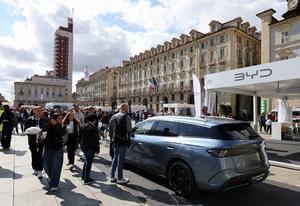 (250928) -- TURIN, 28 septiembre, 2025 (Xinhua) -- Imagen del 27 de septiembre de 2025 de visitantes observando un automóvil exhibido de BYD, en el Salón del Automóvil de Turín, en Turín, Italia. Diecisiete fabricantes chinos trajeron sus nuevos modelos al Salón del Automóvil de Turín este año, casi un tercio de todos los expositores. (Xinhua/Li Jing) (rtg) (ah)