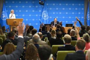 (250928) -- NACIONES UNIDAS, 28 septiembre, 2025 (Xinhua) -- Imagen del 27 de septiembre de 2025 de periodistas levantando las manos para realizar preguntas en una conferencia del ministro de Relaciones Exteriores ruso, Sergei Lavrov, en la sede de la Organización de las Naciones Unidas (ONU), en Nueva York. Cualquier agresión contra Rusia "recibirá una respuesta decisiva", afirmó el sábado el ministro de Relaciones Exteriores ruso, Sergei Lavrov, en su intervención durante el debate general de la Asamblea General de la ONU. (Xinhua/Li Rui) (rtg) (ah)