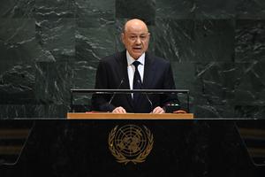 (250925) -- NACIONES UNIDAS, 25 septiembre, 2025 (Xinhua) -- El presidente del Consejo de Liderazgo Presidencial de Yemen, Rashad al-Alimi, pronuncia un discurso durante el debate general del 80º período de sesiones de la Asamblea General de las Naciones Unidas, en la sede de la Organización de las Naciones Unidas, en Nueva York, el 25 de septiembre de 2025. (Xinhua/Li Rui) (rtg) (ce)