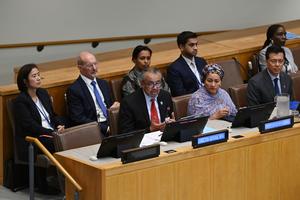 (250925) -- NACIONES UNIDAS, 25 septiembre, 2025 (Xinhua) -- El director general de la Organización Mundial de la Salud, Tedros Adhanom Ghebreyesus (i-frente), habla durante la Cuarta Reunión de Alto Nivel de la Asamblea General de la Organización de las Naciones Unidas (ONU) sobre la prevención y el control de las enfermedades no transmisibles (ENT) y la promoción de la salud mental y el bienestar, en la sede de la ONU, en Nueva York, el 25 de septiembre de 2025. El secretario general de la ONU, António Guterres, instó el jueves a la acción global para reducir las muertes por ENT y para promover la salud mental y el bienestar. (Xinhua/Li Rui) (jg) (ah) (vf)