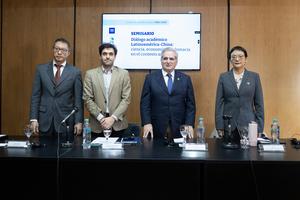 (250926) -- BUENOS AIRES, 26 septiembre, 2025 (Xinhua) -- ( De izq. a der.) El encargado de Negocios de la Embajada de China en Argentina, Wang Xiaoxu, el secretario de Relaciones Internacionales de la Universidad de Buenos Aires (UBA), Patricio Conejero Ortiz, el vicedecano de la Facultad de Ciencias Económicas de la UBA, César Albornoz, y la directora general del Instituto de Estudios Latinoamericanos de la Academia China de Ciencias Sociales (CASS, por sus siglas en inglés), Chai Yu, participan durante el acto de lanzamiento del Centro de Estudios Chinos en Argentina en el marco del Seminario "Diálogos académicos Latinoamérica-China: ciencia, economía y diplomacia en el contexto actual", en la Facultad de Ciencias Económicas de la UBA, en la ciudad de Buenos Aires, capital de Argentina, el 26 de septiembre de 2025. La UBA y la CASS lanzaron el viernes el Centro de Estudios Chinos en Argentina, todo un hito en la cooperación bilateral al permitir profundizar los intercambios y el conocimiento mutuo.(Xinhua/Martín Zabala) (mz) (jg) (ce)