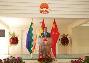 (250926) -- LA PAZ, 26 septiembre, 2025 (Xinhua) -- Imagen del 25 de septiembre del embajador de China en Bolivia, Wang Liang, pronunciando un discurso durante la ceremonia por el 76º aniversario de la fundación de la República Popular China, en la ciudad de La Paz, Bolivia. El Gobierno de Bolivia reafirmó el jueves su compromiso de fortalecer las relaciones bilaterales con China, en el marco de la ceremonia por el 76º aniversario de la fundación de la República Popular China, destacando cuatro décadas de cooperación, respeto mutuo y amistad entre ambos países. (Xinhua/Javier Mamani) (jm) (oa) (ra) (ce)