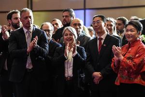 (250927) -- SANTIAGO, 27 septiembre, 2025 (Xinhua) -- Imagen del 26 de septiembre de 2025 del embajador de China en Chile, Niu Qingbao (2-d), y la candidata a la Presidencia de Chile por la izquierda, Jeannette Jara (2-i), reaccionando durante la ceremonia para conmemorar el 76º aniversario de la fundación de la República Popular China, en Santiago, capital de Chile. Autoridades y gremios chilenos destacaron la relación de larga data con China durante la celebración del 76º aniversario de la fundación de la República Popular China, en una ceremonia realizada en Santiago, en la que se festejaron también los 55 años del establecimiento de relaciones diplomáticas entre los dos países. (Xinhua/Jorge Villegas) (jv) (jg) (rtg) (vf)
