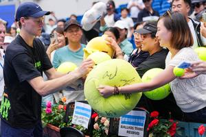 (250929) -- BEIJING, 29 septiembre, 2025 (Xinhua) -- Jannik Sinner firma autógrafos a los espectadores al término del partido de cuartos de final individuales masculinos entre Jannik Sinner, de Italia, y Fabian Marozsan, de Hungría, en el torneo de tenis China Open 2025, en Beijing, China, el 29 de septiembre de 2025. (Xinhua/Na Yuqi) (rtg) (ah) (vf)