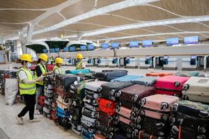 (250929) -- GUANGZHOU, 29 septiembre, 2025 (Xinhua) -- Empleados realizan una prueba de equipaje facturado, en el área de salidas de la Terminal T3 del Aeropuerto Internacional Baiyun de Guangzhou, en Guangzhou, en la provincia de Guangdong, en el sur de China, el 29 de septiembre de 2025. La construcción de la Terminal T3 del Aeropuerto Internacional Baiyun de Guangzhou se ha completado en gran parte recientemente. Se espera que la terminal entre en funcionamiento a finales de 2025. (Xinhua/Liu Dawei) (rtg) (ah)