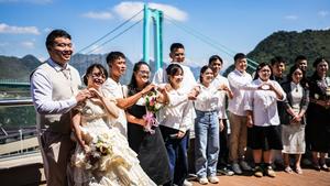(250929) -- ZHENFENG, 29 septiembre, 2025 (Xinhua) -- Imagen del 28 de septiembre de 2025 de parejas posando para una fotografía grupal en la terraza del área de servicio de Yundu, cerca del Puente del Gran Cañón de Huajiang, en el distrito de Zhenfeng, en la provincia de Guizhou, en el suroeste de China. El Puente sobre el Gran Cañón de Huajiang, el puente más alto del mundo abrió al tráfico la mañana del domingo, en la provincia de Guizhou, en el suroeste de China reduciendo el tiempo de viaje a través de un profundo cañón de dos horas a solo dos minutos después de tres años de construcción. (Xinhua/Tao Liang) (rtg) (ah) (vf)