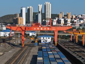 (250927) — SUIFENHE, 27 septiembre, 2025 (Xinhua) — Vista aérea tomada con un dron el 27 de septiembre de 2025 de una grúa pórtico realizando operaciones de transbordo en un tren de carga China-Europa que regresa a la estación de Suifenhe, en Suifenhe, en la provincia de Heilongjiang, en el noreste de China. Una importante mejora de un ferrocarril que une Suifenhe con la frontera entre China y Rusia se completó el sábado, con nuevas vías puestas en funcionamiento permitiendo que los trenes circulen a velocidades de hasta 120 kilómetros por hora, más del doble del límite anterior de 55 kilómetros por hora, mejorando significativamente la capacidad de transporte. (Xinhua/Wang Song) (jg) (rtg) (vf)