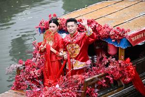 (250929) -- SUZHOU, 29 septiembre, 2025 (Xinhua) -- Una pareja realiza un recorrido en bote durante una boda colectiva, en el antiguo poblado de Luzhi, en Suzhou, en la provincia de Jiangsu, en el este de China, el 29 de septiembre de 2025. (Xinhua/Ji Chunpeng) (oa) (ah) (vf)