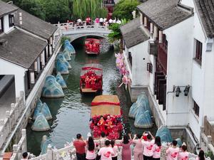(250929) -- SUZHOU, 29 septiembre, 2025 (Xinhua) -- Imagen tomada con un dron el 29 de septiembre de 2025 de parejas realizando un recorrido en bote durante una boda colectiva, en el antiguo poblado de Luzhi, en Suzhou, en la provincia de Jiangsu, en el este de China. (Xinhua/Ji Chunpeng) (oa) (ah) (vf)