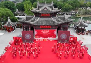 (250929) -- SUZHOU, 29 septiembre, 2025 (Xinhua) -- Imagen tomada con un dron el 29 de septiembre de 2025 de parejas participando en una boda colectiva, en el antiguo poblado de Luzhi, en Suzhou, en la provincia de Jiangsu, en el este de China. (Xinhua/Ji Chunpeng) (oa) (ah) (vf)
