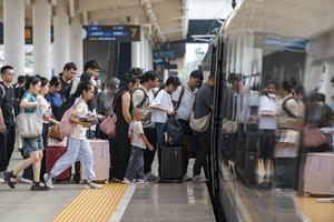 (250929) -- BEIJING, 29 septiembre, 2025 (Xinhua) -- Pasajeros abordan un tren en la Estación de Ferrocarriles de Jinhua, en Jinhua, en la provincia de Zhejiang, en el este de China, el 29 de septiembre de 2025. La temporada alta de viajes por las vacaciones del Día Nacional de China, comenzó el 29 de septiembre y durará hasta el 10 de octubre. (Xinhua/Hu Xiaofei) (rtg) (ah) (vf)