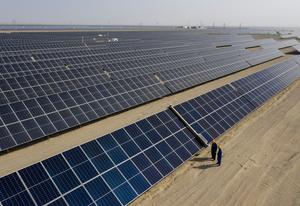 (250927) -- URUMQI, 27 septiembre, 2025 (Xinhua) -- Vista aérea tomada con un dron el 22 de septiembre de 2025 de trabajadores patrullando un proyecto fotovoltaico de cuatro millones de kilovatios, en el distrito de Ruoqiang, en la prefectura autónoma mongola de Bayingolin, en la región autónoma de la etnia uygur de Xinjiang, en el noroeste de China. Xinjiang, una región rica en recursos de energía solar y eólica, ha desarrollado vigorosamente la industria de la nueva energía en los últimos años, acelerando la construcción de proyectos de base de energía eólica y fotovoltaica a gran escala. (Xinhua/Chen Shuo) (jg) (rtg) (vf)