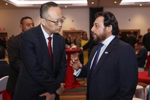 (250926) -- SAN SALVADOR, 26 septiembre, 2025 (Xinhua) -- Imagen del 24 de septiembre de 2025 del encargado de Negocios de la Embajada de China en El Salvador, Ma Ning (i), conversando con el vicepresidente de El Salvador, Félix Ulloa (d), durante una recepción por el 76º aniversario de la fundación de la República Popular China, en San Salvador, capital de El Salvador. Altos funcionarios salvadoreños, ministros, diputados, representantes del partido político Nuevas Ideas, así como del cuerpo diplomático acreditado en el país centroamericano y de la comunidad china en El Salvador, celebraron el miércoles el 76º aniversario de la fundación de la República Popular China con una emotiva ceremonia que unió tradición, música y danza. (Xinhua/Alexander Peña) (ap) (jg) (rtg) (ce)