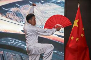 (250926) — SAN SALVADOR, 26 septiembre, 2025 (Xinhua) — Imagen del 24 de septiembre de 2025 de un joven estudiante del Instituto Confucio de la Universidad de El Salvador realizando una danza tradicional china durante una recepción por el 76º aniversario de la fundación de la República Popular China, en San Salvador, capital de El Salvador. Altos funcionarios salvadoreños, ministros, diputados, representantes del partido político Nuevas Ideas, así como del cuerpo diplomático acreditado en el país centroamericano y de la comunidad china en El Salvador, celebraron el miércoles el 76º aniversario de la fundación de la República Popular China con una emotiva ceremonia que unió tradición, música y danza. (Xinhua/Alexander Peña) (ap) (jg) (rtg) (ce)