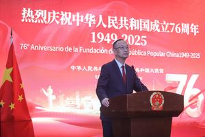 (250926) -- SAN SALVADOR, 26 septiembre, 2025 (Xinhua) -- Imagen del 24 de septiembre de 2025 del encargado de Negocios de la Embajada de China en El Salvador, Ma Ning, hablando durante una recepción por el 76º aniversario de la fundación de la República Popular China, en San Salvador, capital de El Salvador. Altos funcionarios salvadoreños, ministros, diputados, representantes del partido político Nuevas Ideas, así como del cuerpo diplomático acreditado en el país centroamericano y de la comunidad china en El Salvador, celebraron el miércoles el 76º aniversario de la fundación de la República Popular China con una emotiva ceremonia que unió tradición, música y danza. (Xinhua/Alexander Peña) (ap) (jg) (rtg) (ce)