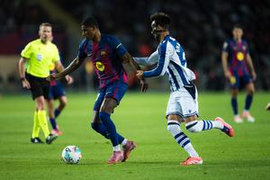 (250929) -- BARCELONA, 29 septiembre, 2025 (Xinhua) -- Imagen del 28 de septiembre de 2025 de Marcus Rashford (i), de FC Barcelona, disputando el balón con Brais Méndez, de Real Sociedad, durante el partido de fútbol de LaLiga entre FC Barcelona y Real Sociedad, en el Estadio Olímpico Lluís Companys, en Barcelona, España. (Xinhua/Joan Gosa) (oa) (ah) (vf)