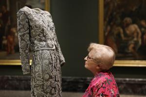 (250926) -- MILAN, 26 septiembre, 2025 (Xinhua) -- Imagen del 25 de septiembre de 2025 de una mujer observando una creación exhibida en la exposición "Giorgio Armani: Milano, per amore" en la Pinacoteca de Brera, en Milán, Italia. Más de 120 creaciones de Armani/Archivio son exhibidas entre las pinturas de la Pinacoteca de Brera desde el 24 de septiembre de 2025 hasta el 11 de enero de 2026, para honrar la trayectoria estilística del diseñador de moda italiano Giorgio Armani, fallecido el 4 de septiembre de 2025. (Xinhua/Li Jing) (oa) (ra)